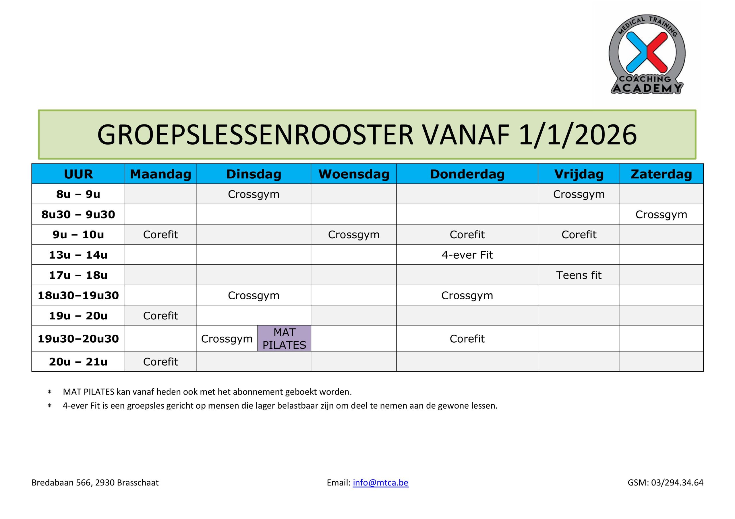 Je kan alle dagen komen sporten bij MTCA. Alle dagen zal er een andere work-out voorgeschreven worden volgens de nieuwe methode. Aan afwisseling en begeleiding geen gebrek tijdens